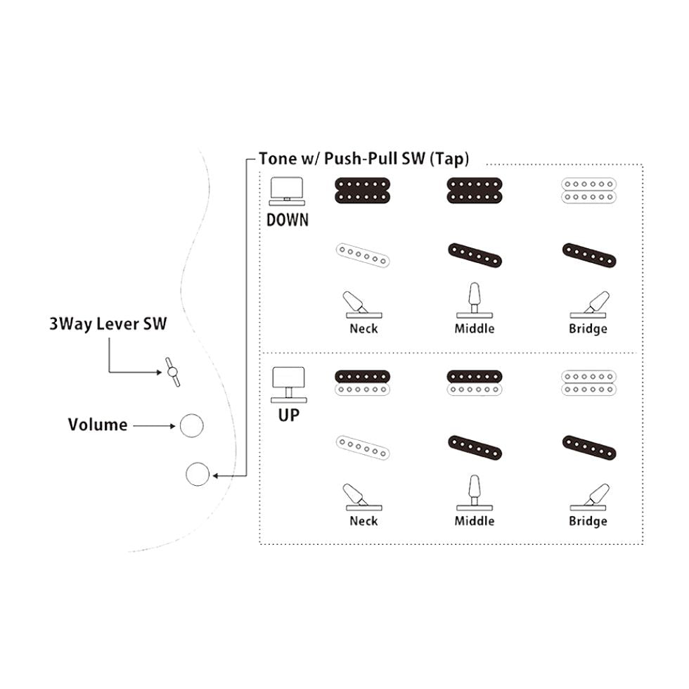 Los controles son 1 volumen, 1 tono y un interruptor de palanca de 3 posiciones. El potenciómetro TONE es un SW push-pull, y puedes hacer un coil-tap en cada cápsula humbucker. Al hacer un uso completo de esto y del volumen y el tono, es posible una amplia gama de creación de sonido.